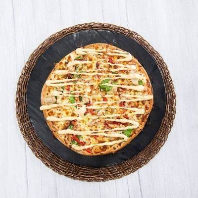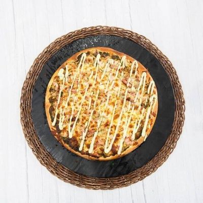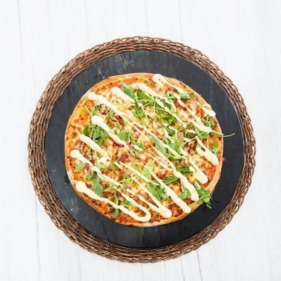 Tomato & Garlic Base Sauce, Bacon, Chicken, Onion, Mozzarella, Garlic Aioli and Fresh Parsley.
