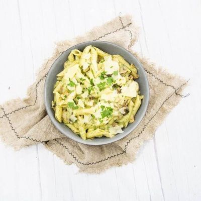 Chicken and mushroom in a creamy pesto sauce topped with parmesan and parsley