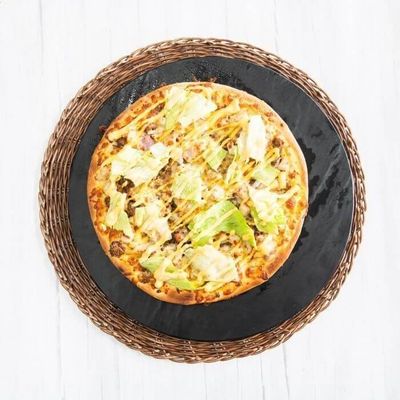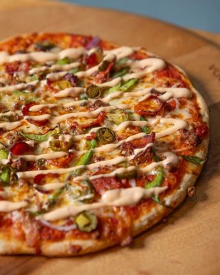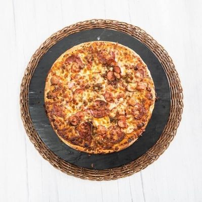 Tomato Base Sauce, Beef, Pepperoni, Capsicum, Jalapenos, Onion, Mozzarella and Chilli Flakes.