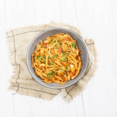 Prawns, Mushroom, Fresh Parsley and Creamy Pink Sauce.