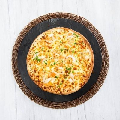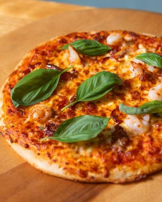 Tomato & Garlic Base Sauce, Pepperoni, Onion, Feta, Mozzarella, Prawns, Chilli Flakes and Oregano.