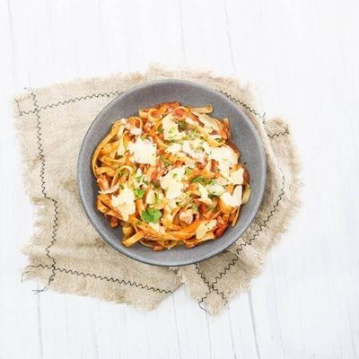 Salami, olives and mushrooms topped in a spicy pink sauce topped with parmesan and parsley
