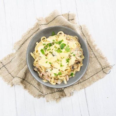 Garlic & Cream Base Sauce, Ham, Mushroom, Mozzarella, Cracked Pepper, Fresh Parsley and Parmesan.